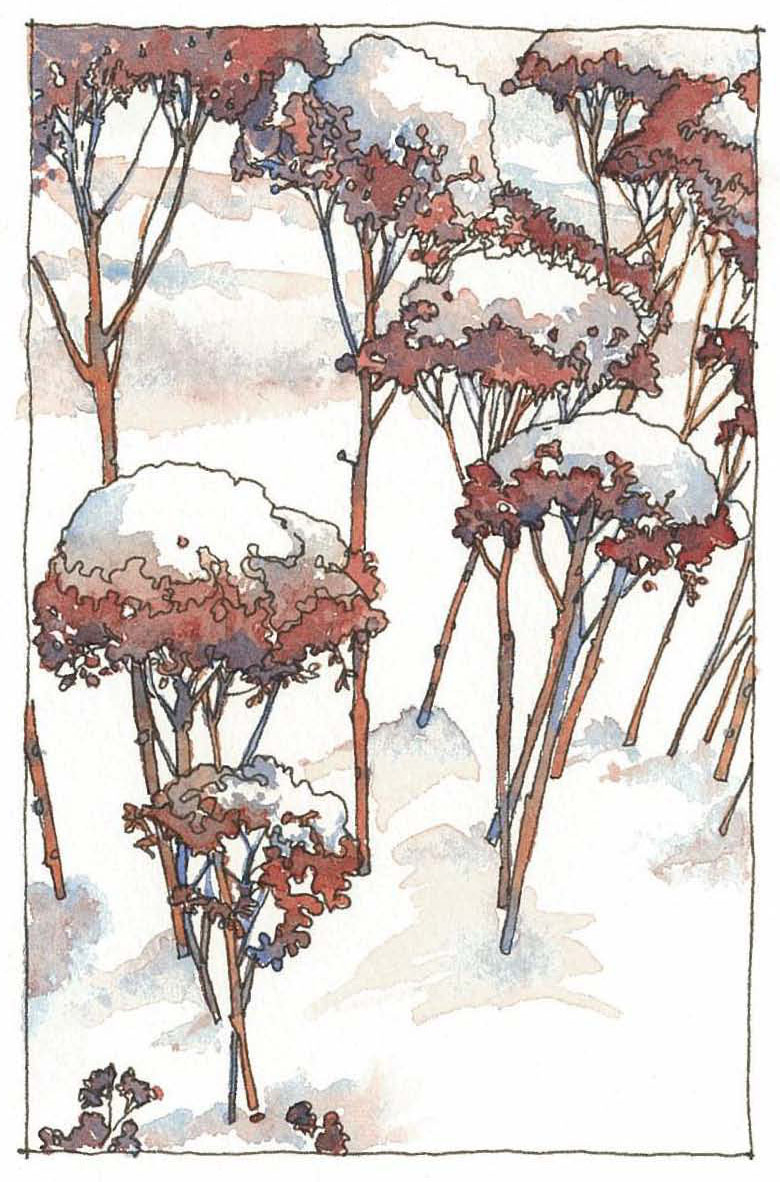 It’s been a busy holiday season so far, definitely weighted toward the week before Christmas through today. Tom and I had to say goodbye to Michael yesterday, and Liz, Savannah and Ryan this morning. Cynnie lives nearby but we have seen a wonderfully lot of her since her sister and step-brother have been home. We will be back into our regular schedule of events and responsibilities Monday.  Today and tomorrow are days of rest. However, I had intended to post the past 5 years of holiday cards before Christmas, and did not get to that task, so here they are, still fitting into the 12 Days of Christmas. 2009 was my first year of homemade holiday cards. I painted watercolor on a pen and ink drawing of our front porch decked out for the holidays. We live in a 1903 victorian two family, a beautiful place, in the Elmwood Village Neighborhood of the City of Buffalo. 2009   In 2010 I was taken by the snow on a neighbor’s sedum. This card has been called a takeoff on a Japanese wood cut. I love that, and consider it a compliment since I studied printmaking as a college student, and have always loved Japanese artwork. 2010 2011 was a busy year, and I was lucky enough to have already painted this watercolor painting of the weeping mulberry in our backyard covered with snow. It’s a view I have from my breakfast table in our kitchen.  I love the patterns of light and shadow on the snow.