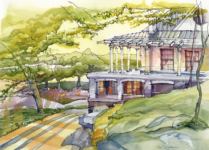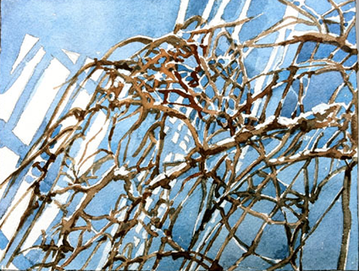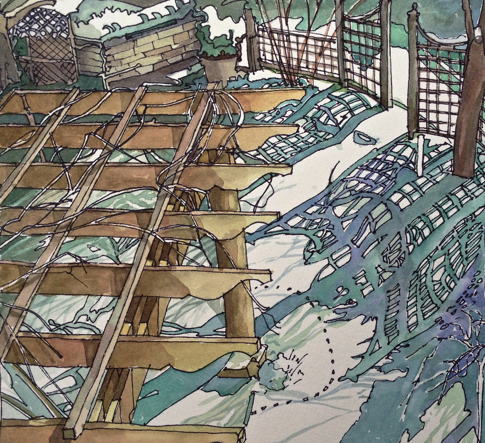 2013 presented another incredibly busy fall and early winter, so I went back to an ink drawing I had started a year or so before, finished the drawing concentrating on the patterns of shadow from Tom’s fencing, and added watercolor.  The pergola is the structure that Tom and I designed together. He built it in his shop in the basement. What an incredible talent he has for planning and design. I’m good with ideas, but I like to have the option of being able to change my direction as often and whenever I want!  Not good if you are building a pergola!  Good if you are painting! It was a challenge to be an architect. I am very happy to have retired in 2010!