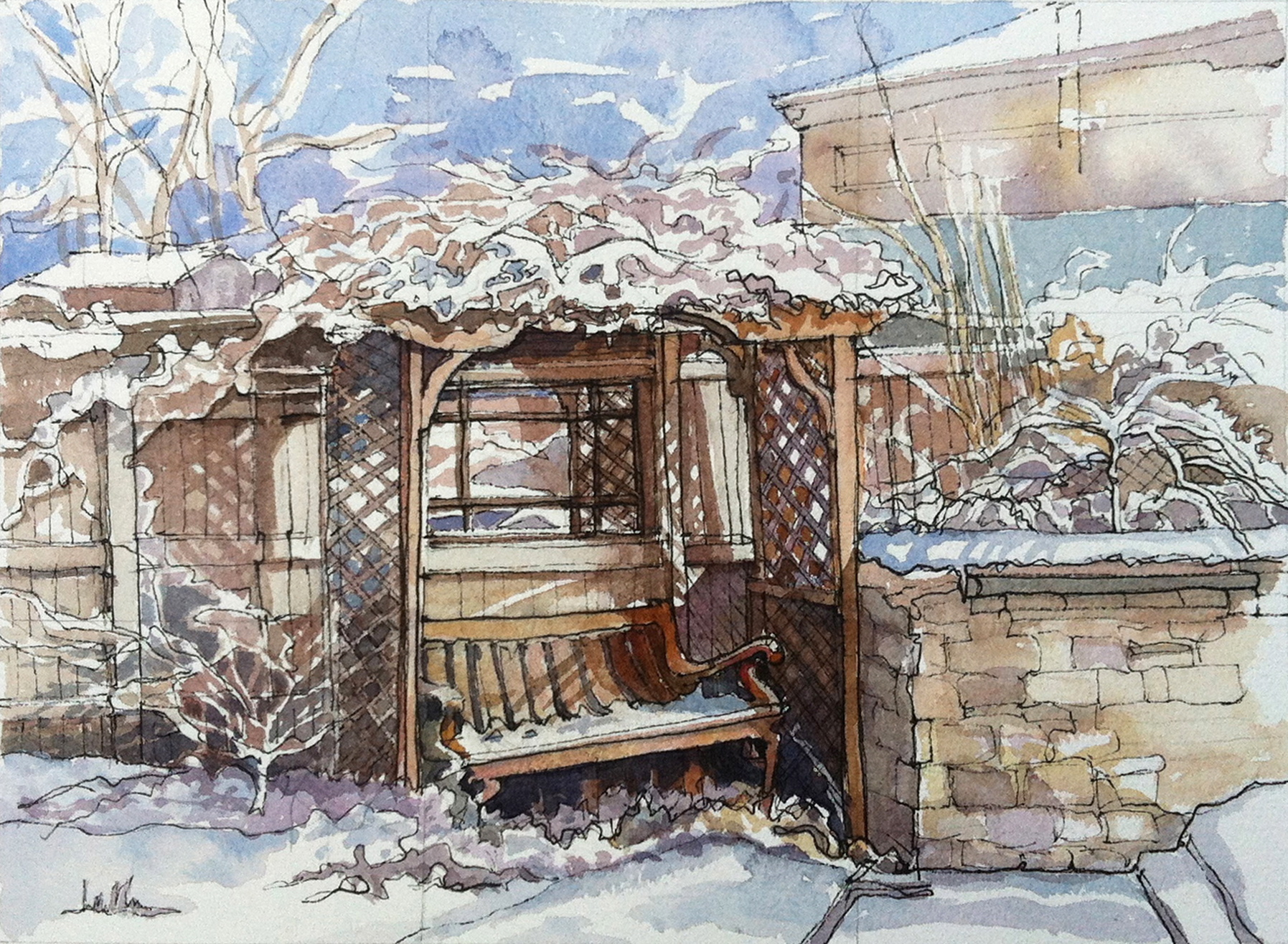 In 2012 I had time to dig through the many photos Tom and I have both taken of our backyard garden in all four seasons. This watercolor and pen and ink winter scene is of the grape arbor sheltering our resting bench next to the pond and wall Tom created.
