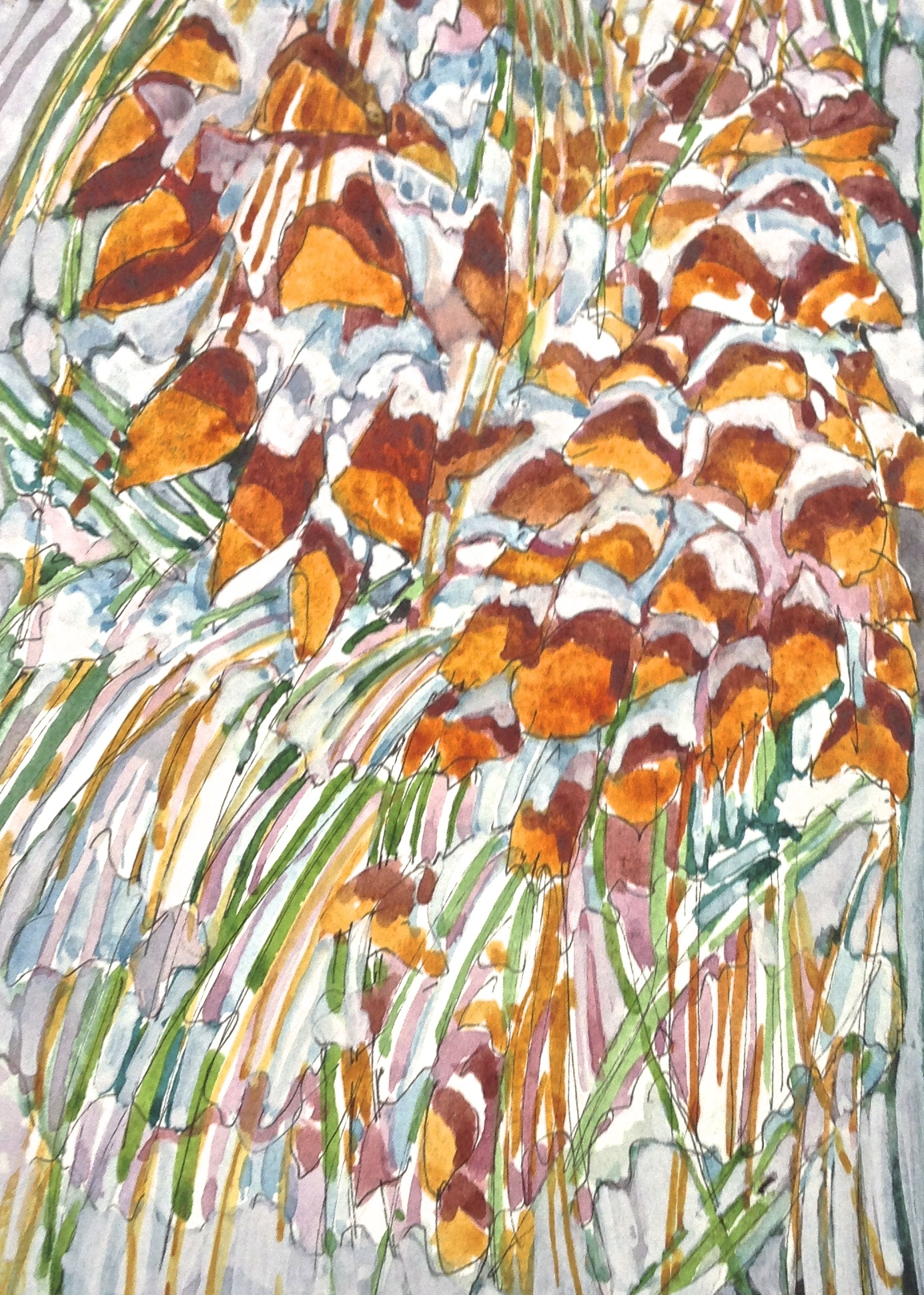 This is this year’s card which I labelled on the back “Pine Cone Abstraction” because after I had finished it and had sent it off to Vistaprint, Tom looked at it and said -“I like it, but I have to admit that I don’t know what it is. Sorry.” I like it too, full of light, and cheery. It’s watercolor and gouache on a pen and ink drawing.