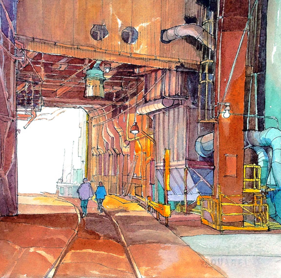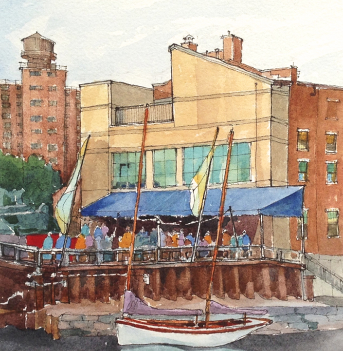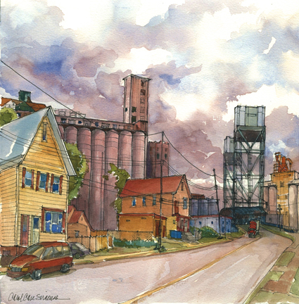 I had 14 pieces in the show, and have sold 11! The pieces that are left are three of my favorites so I don’t mind taking them home, but I wouldn’t mind selling the either! They are this 12″ square ink and watercolor of the Larkin Power House. The 6″ inch square ink and watercolor of the much invigorated Buffalo Canalside below left, and The Cobblestone District Wall on the right, also 6″ square.