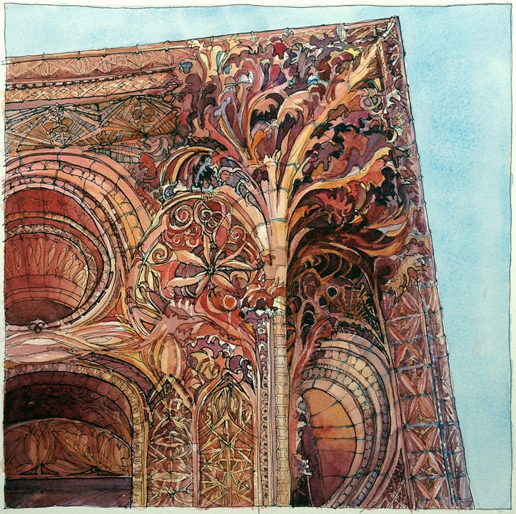 More incredibile terra cotta, and brilliant coloration. Tom took the photo I worked from. We didn’t realize until we took a much closer look that there are two workmen “hanging out” on the building. Look closely.