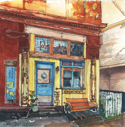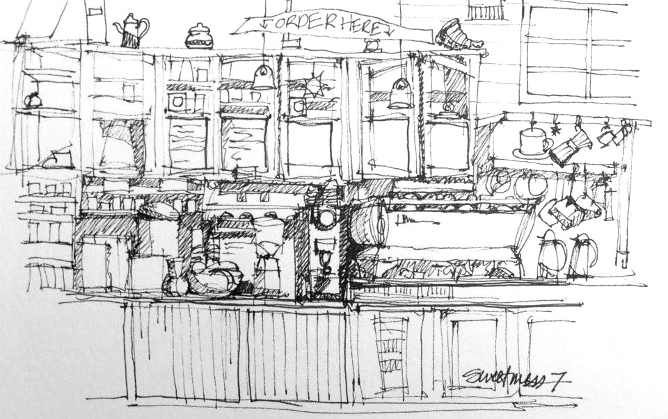 My resolve for 2015 is to sketch more at home. These three are from favorite local places, some still here, some moved and changed. Favorites are Sweetness 7, Bistro Europa in its older more intimate setting and location and, for those of you who are Buffalonians, the inimitable Spot, this one is on Elmwood.  Love it.