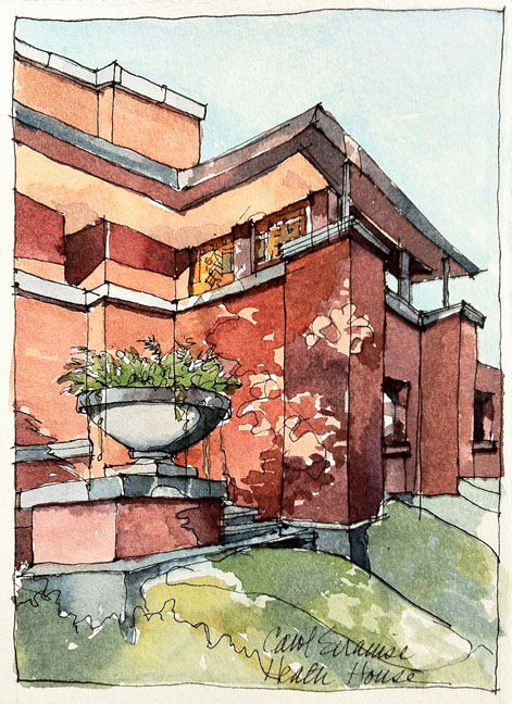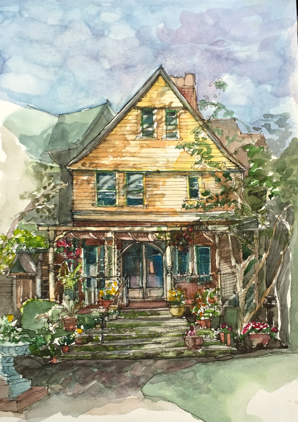 Here I am hard at work on a pen and ink sketch of Ellie Dorritie’s front yard. I haven’t finished the watercolor additions yet, but here’s the sketch too.  A great cottage on Little Summer Street in Buffalo.