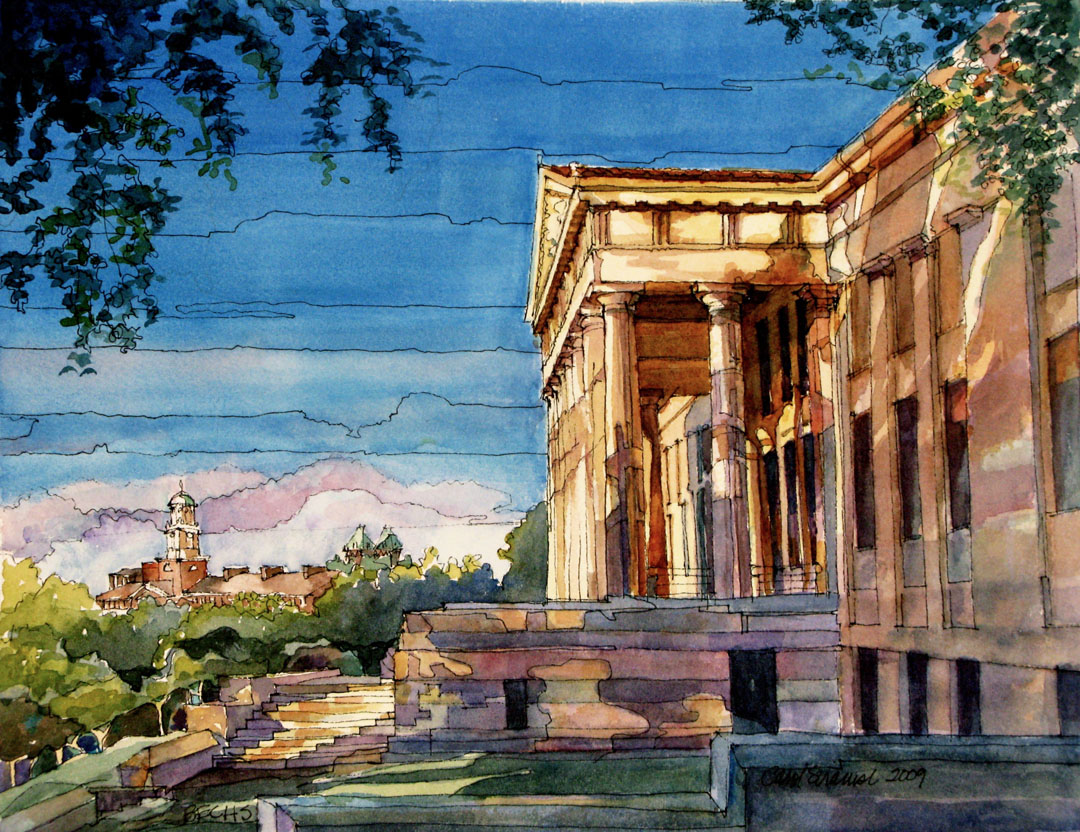 When I painted this pen and ink and watercolor painting this building was called the Buffalo and Erie County Historical Society.  Now its the Buffalo History Museum. The photos I took were just after sunrise, coloring the marble beautiful shades of yellow gold through deep purply blue.