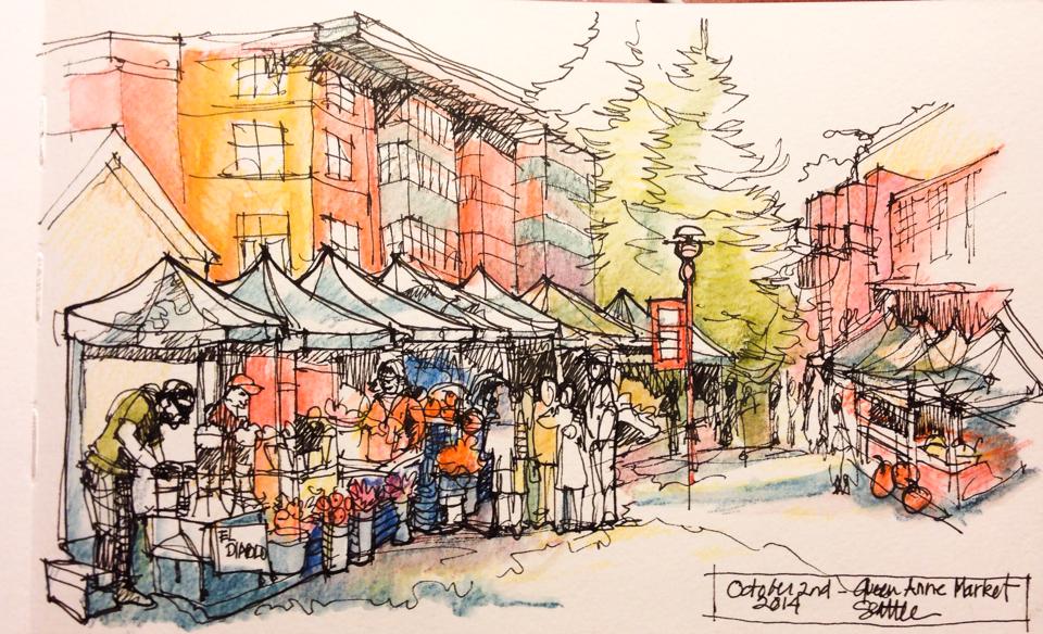 I sketch wherever we go as much as I can, markets and coffee houses, and food carts. The sketch below is of the wonderful Queen Anne Thursday Market in Seattle, WA.
