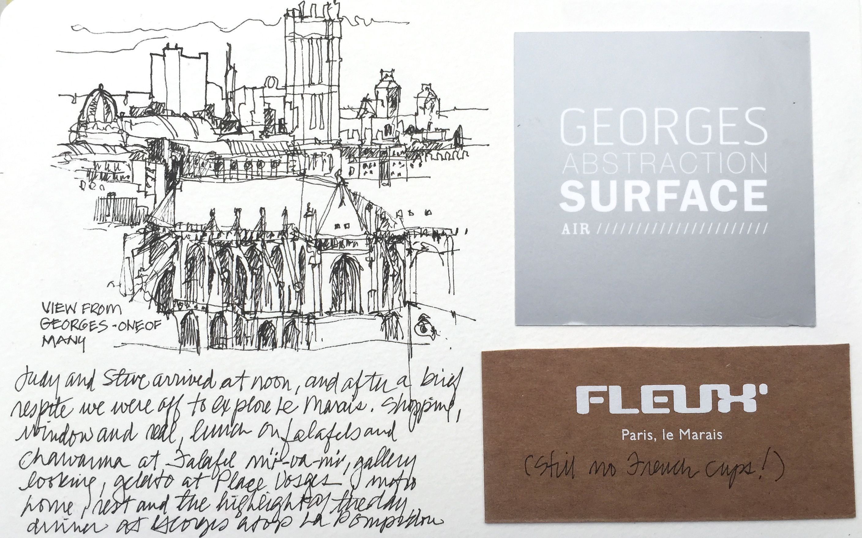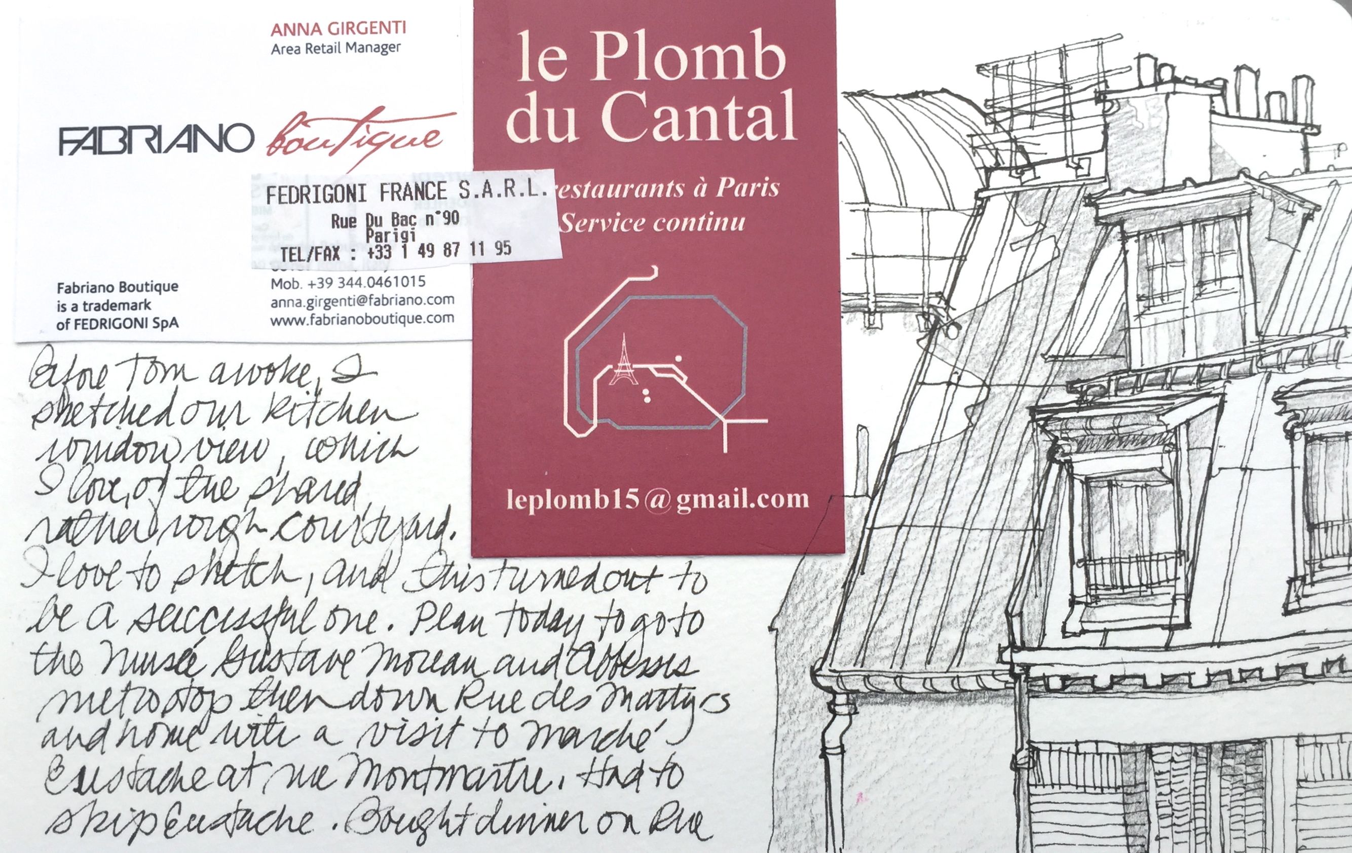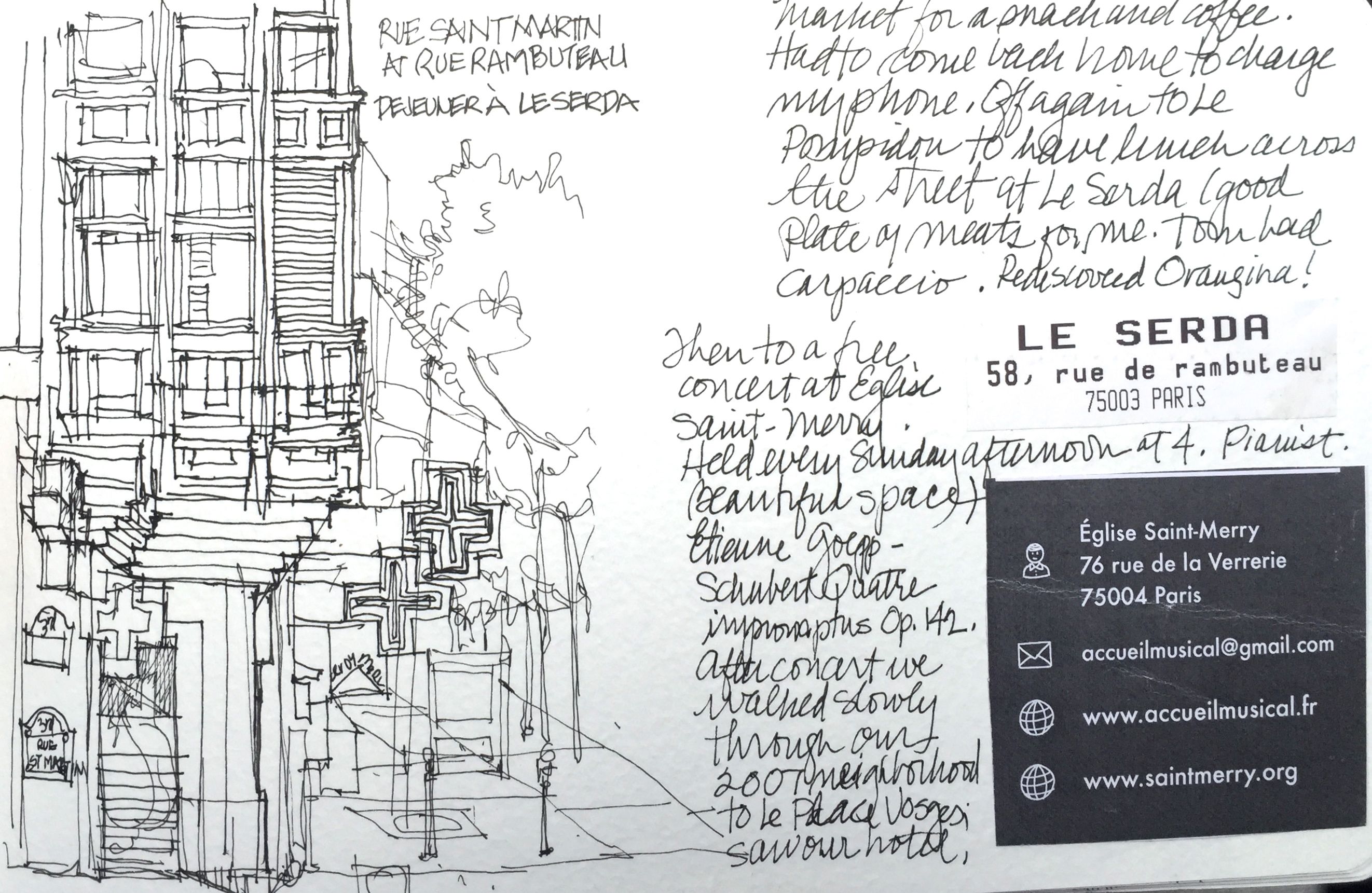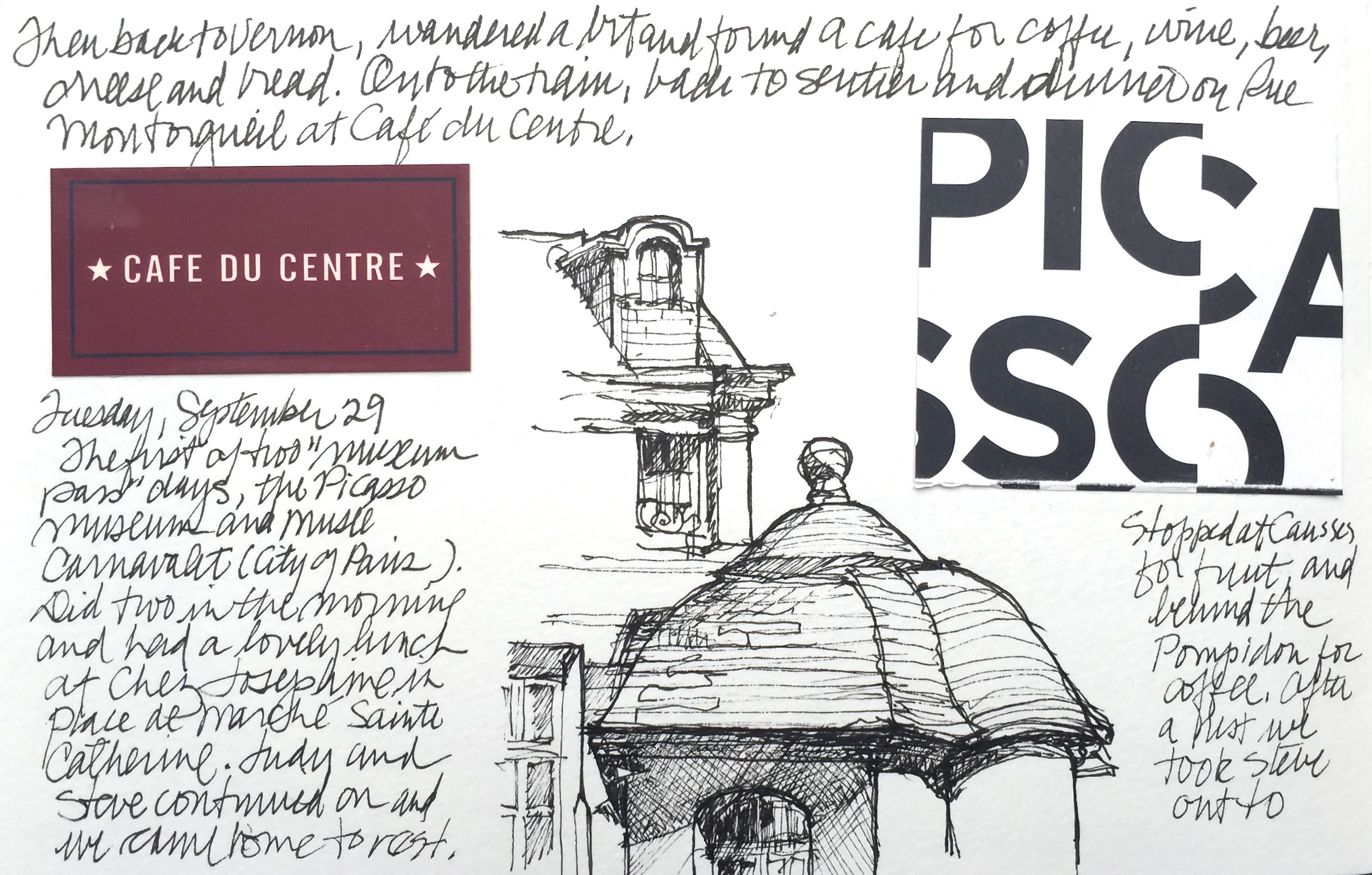The sketch on the left is from our dinner table the first night in our neighborhood. On the right is from our coffee break near the Pompidou.