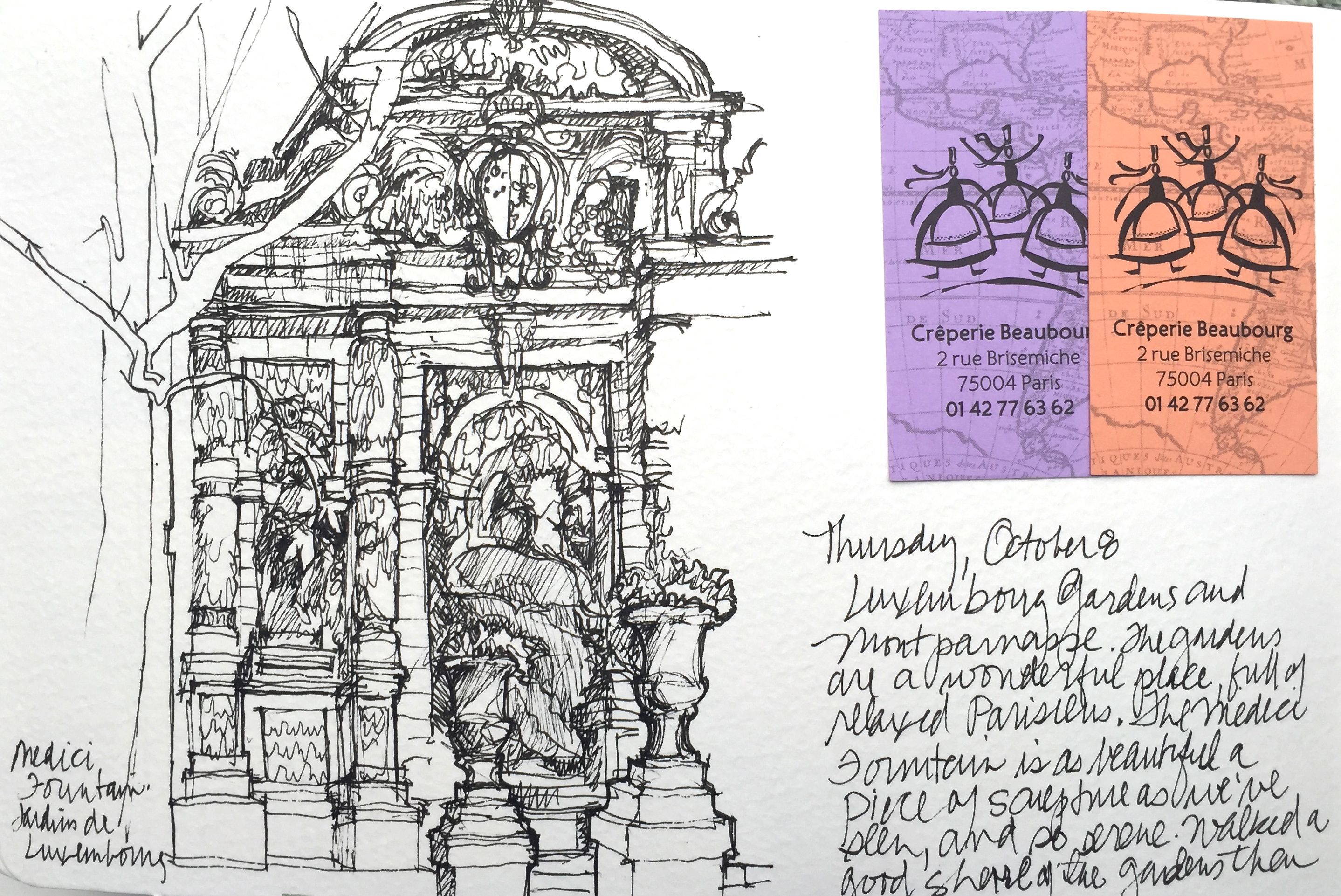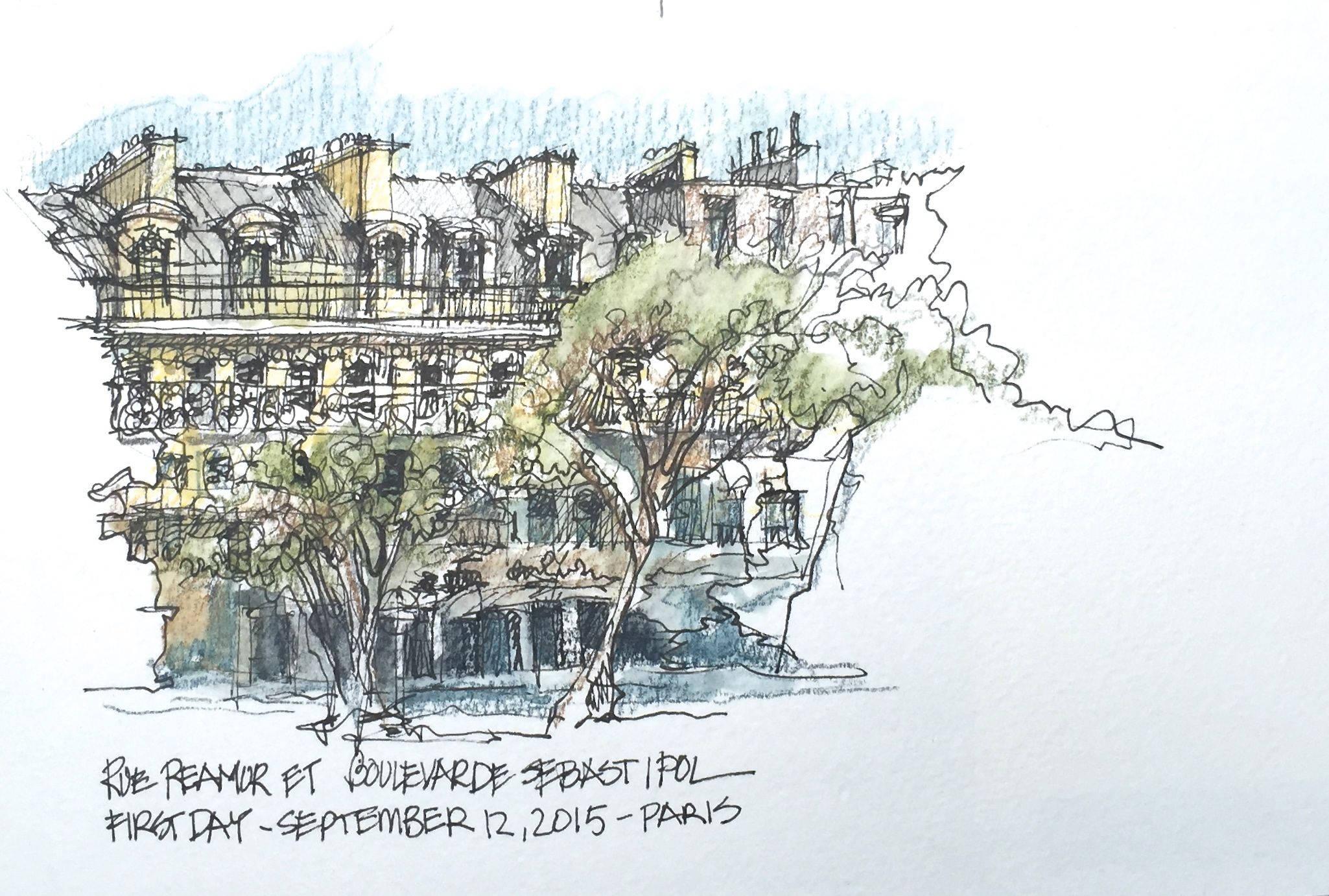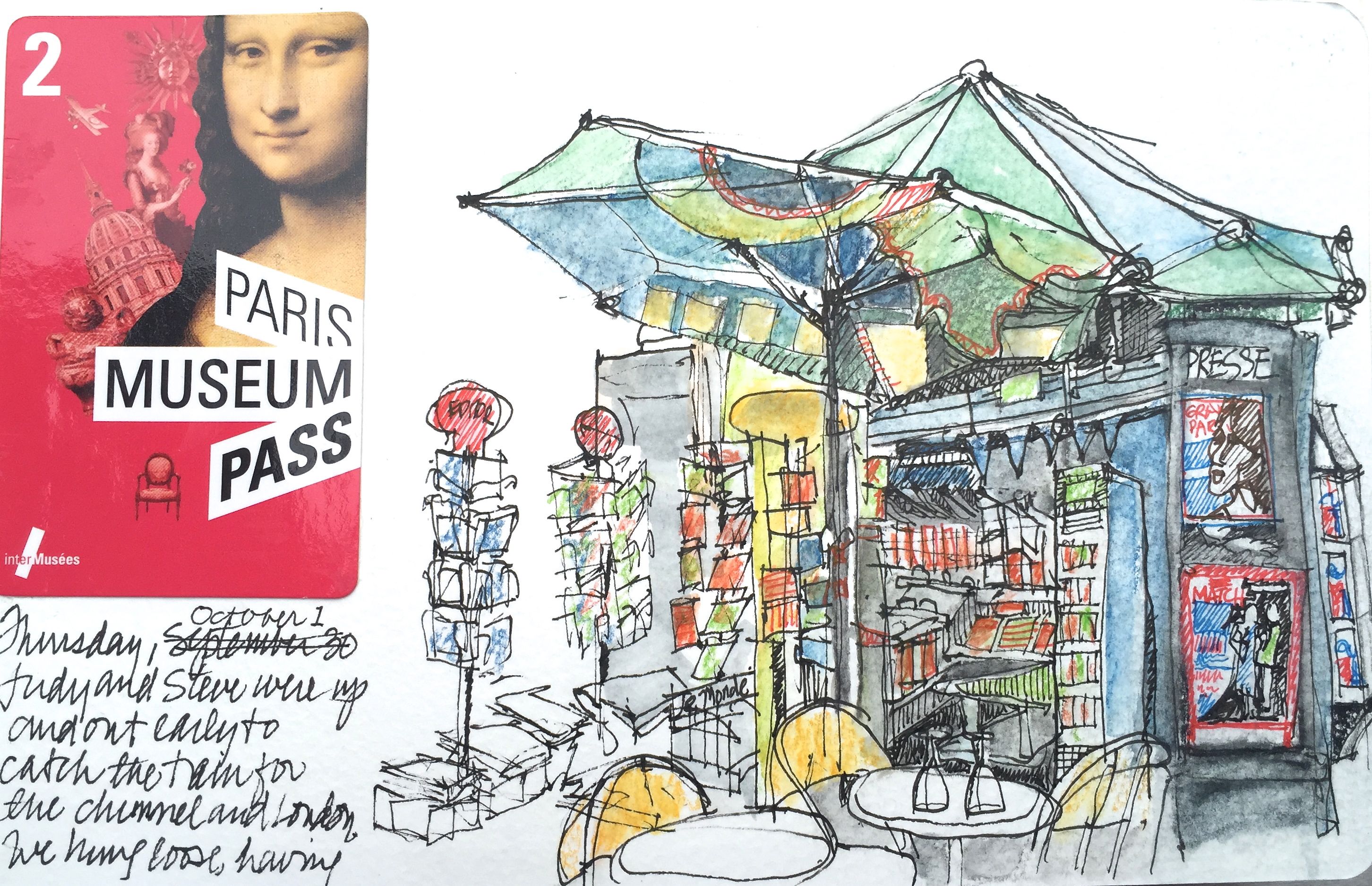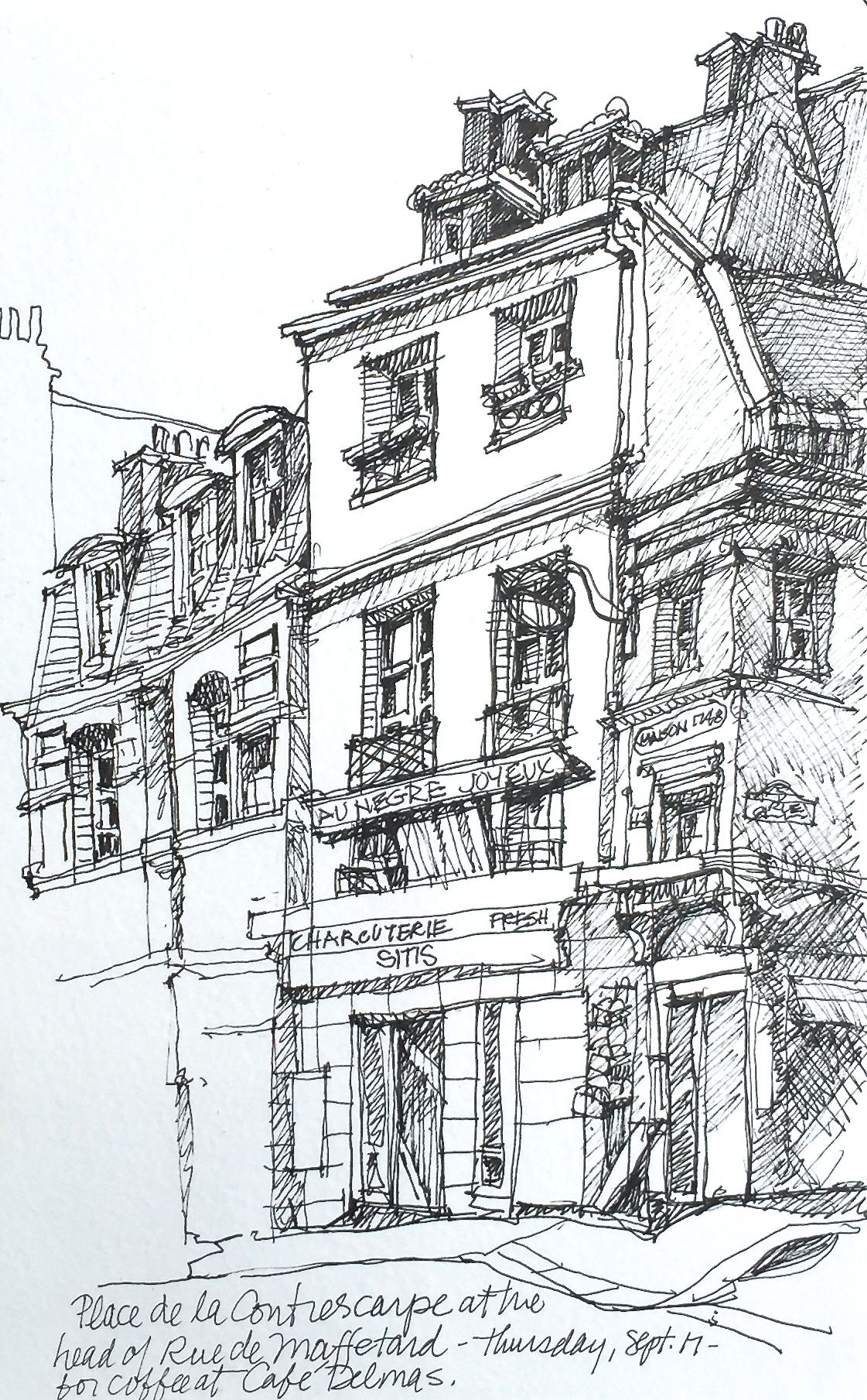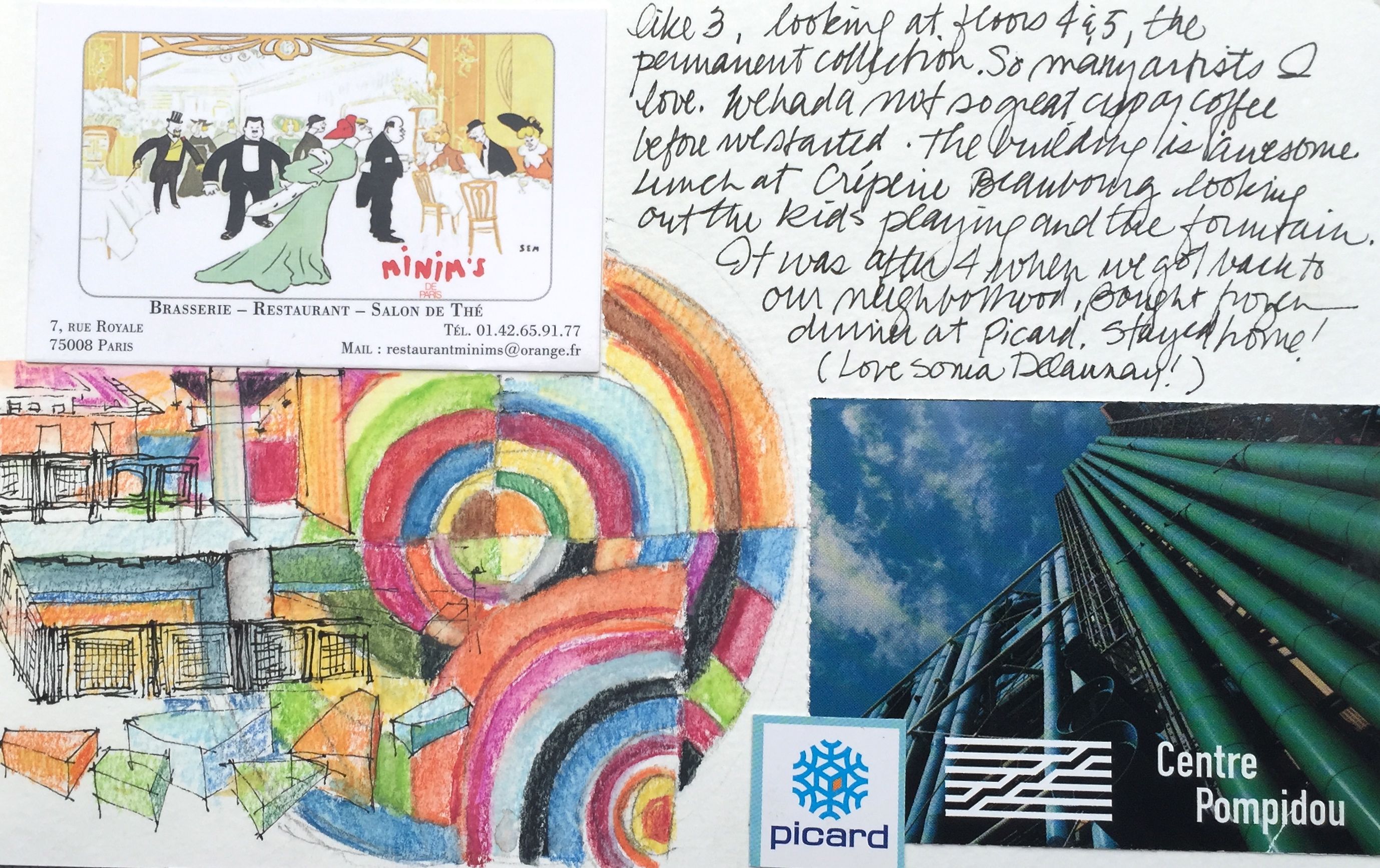 The sketch on the left is from our dinner table the first night in our neighborhood. On the right is from our coffee break near the Pompidou.