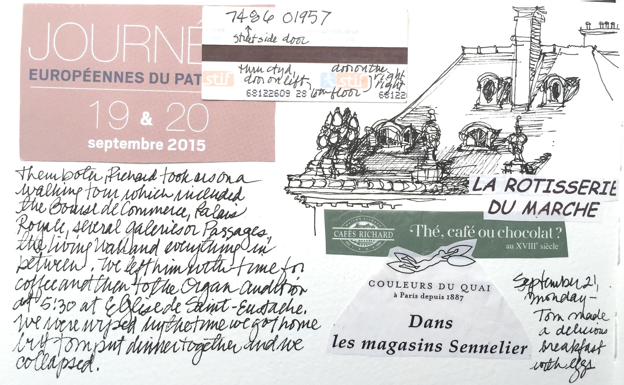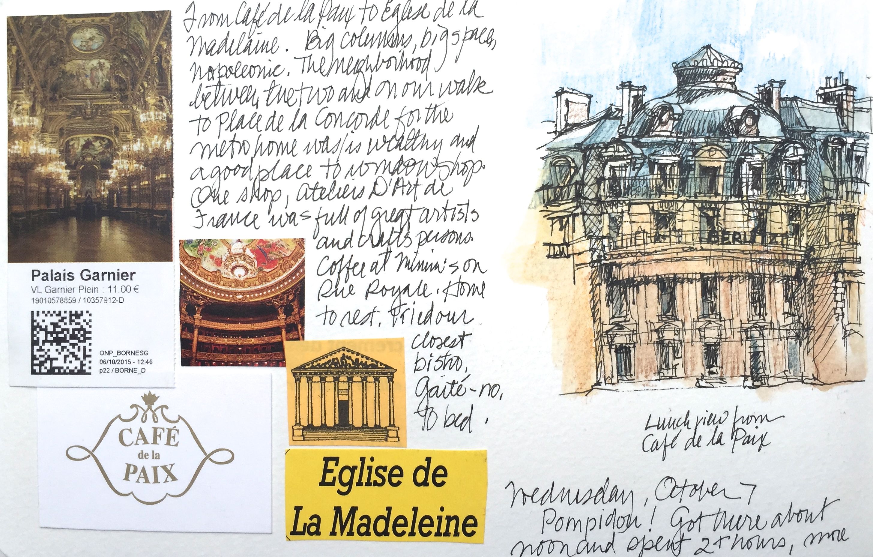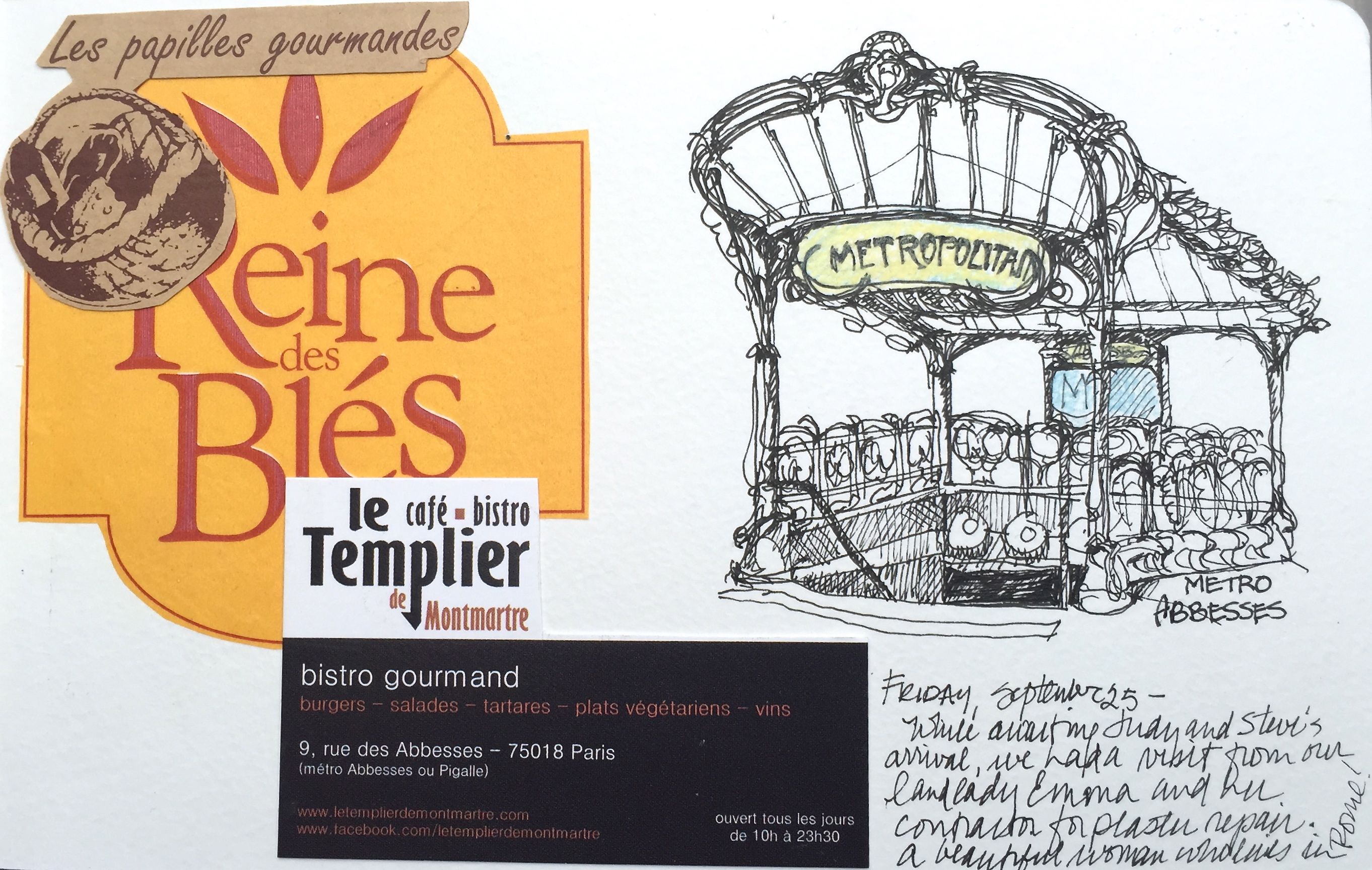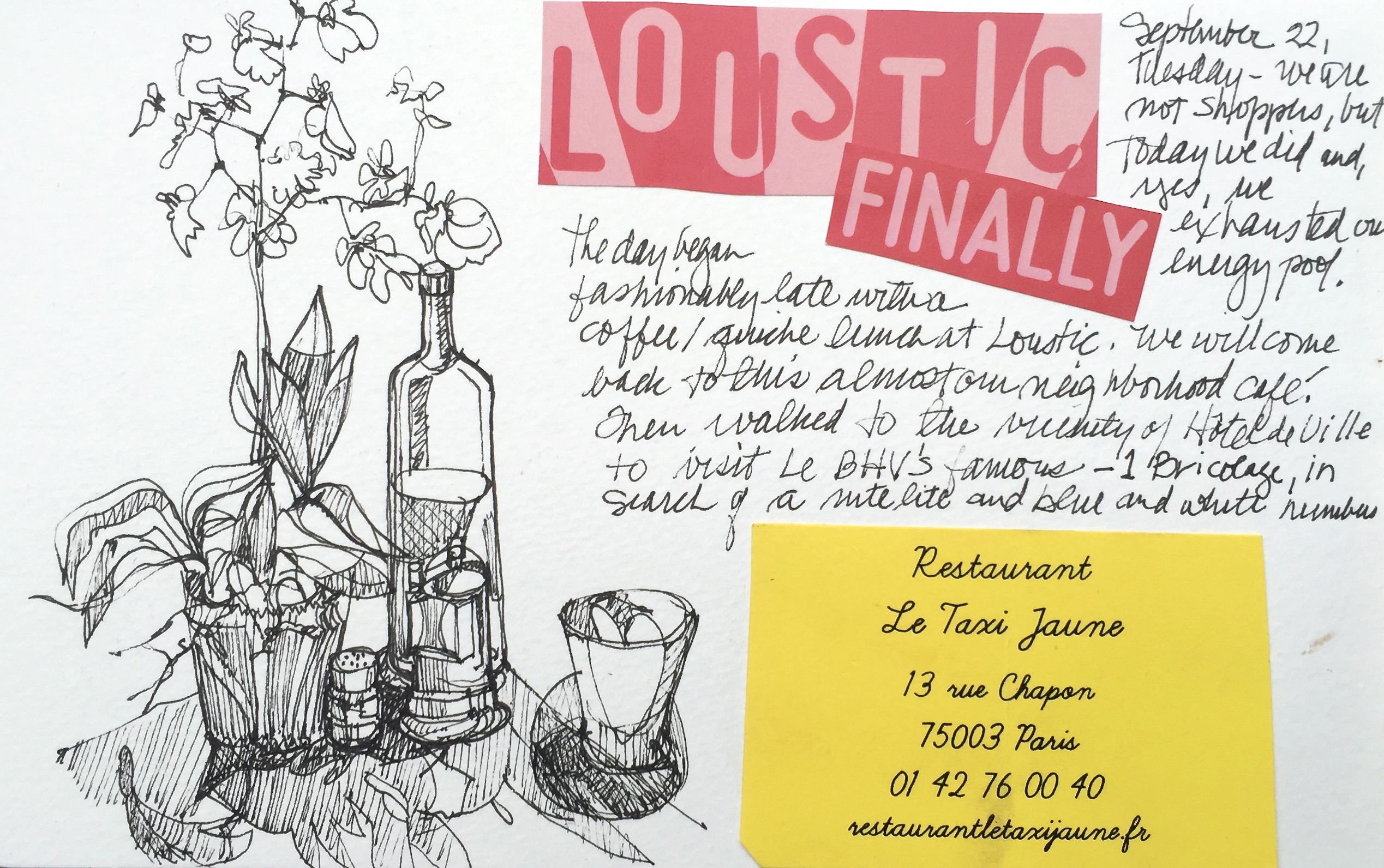The sketch on the left is from our dinner table the first night in our neighborhood. On the right is from our coffee break near the Pompidou.