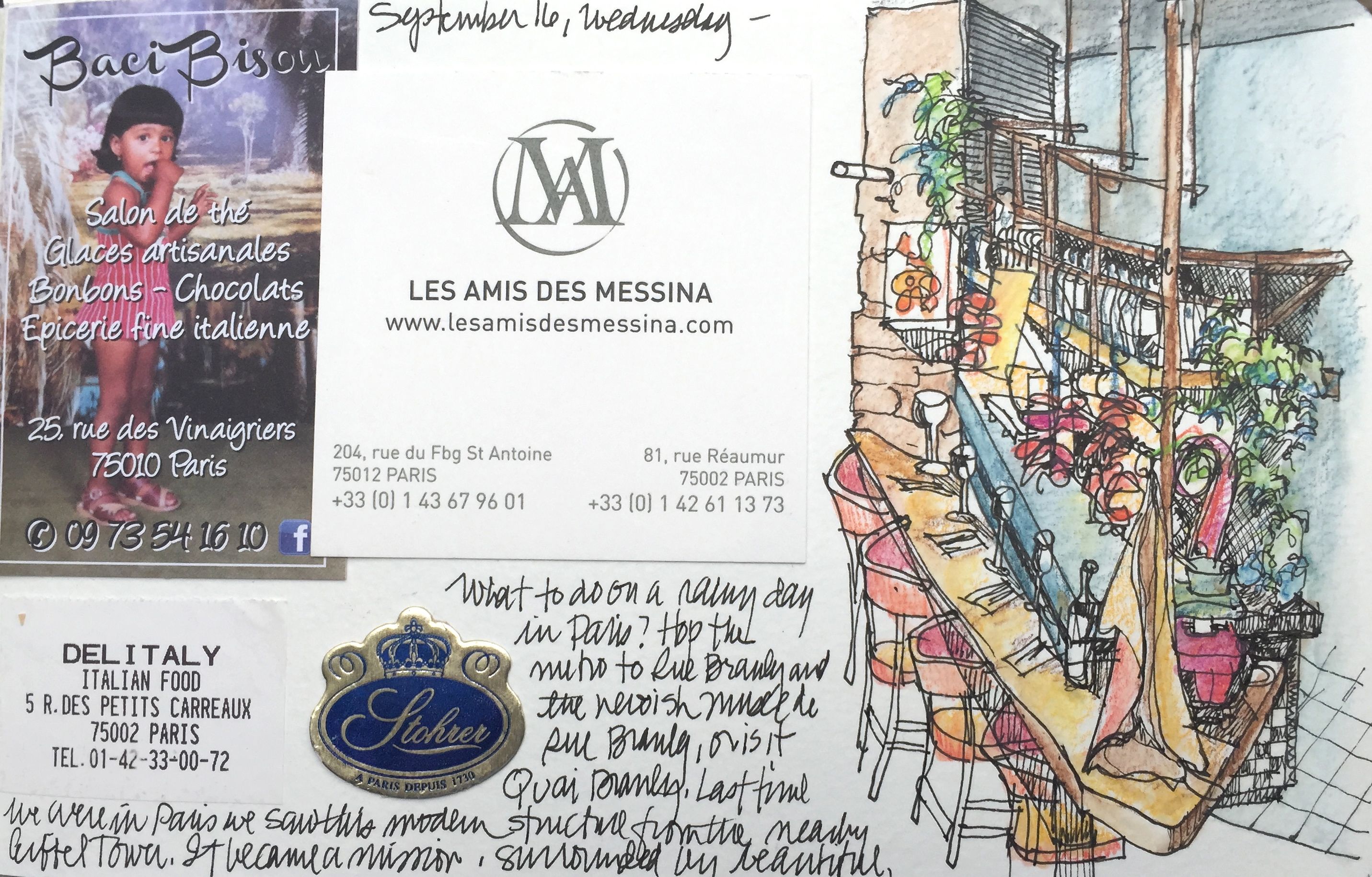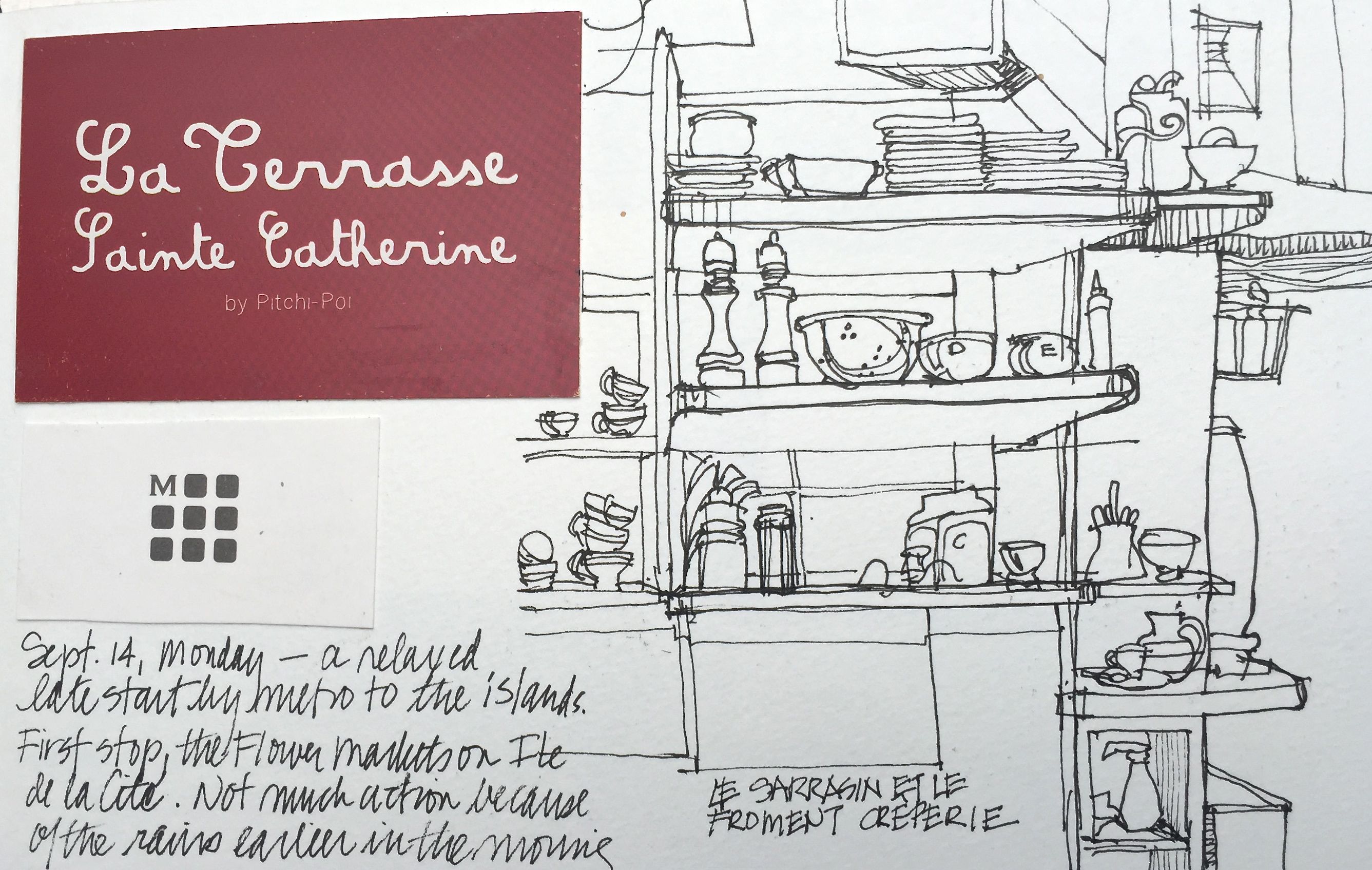 There are always things to draw. Left is shelves from a creperie on Ile St outs, and right is a market on Rue Montorgueil in our neighborhood.