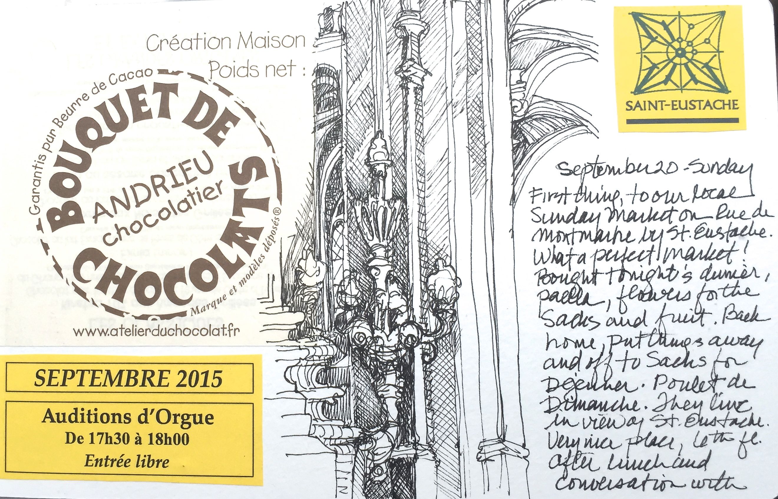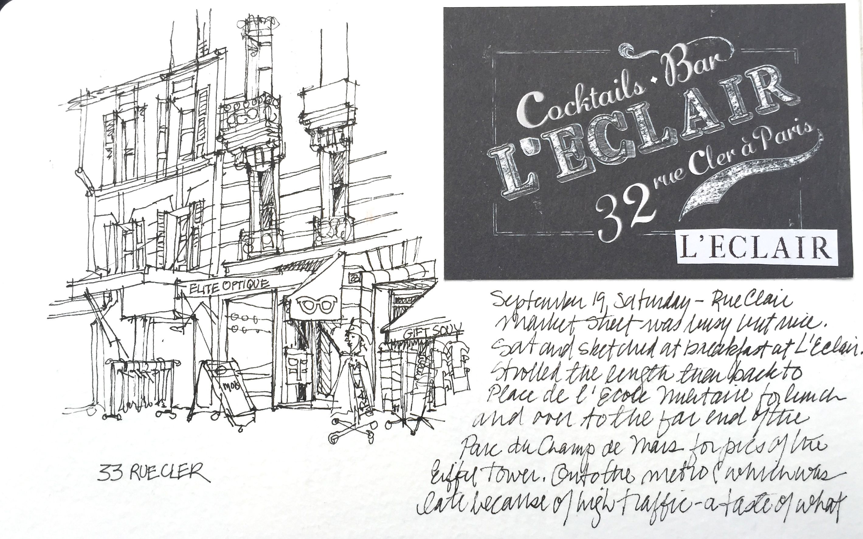 A quick, very quick and unfinished sketch, during Richard Sack’s walking run, not far from Palais Royale, and a leisurely dinner sketch at Restaurant Le Taxi Jaune, a favorite.