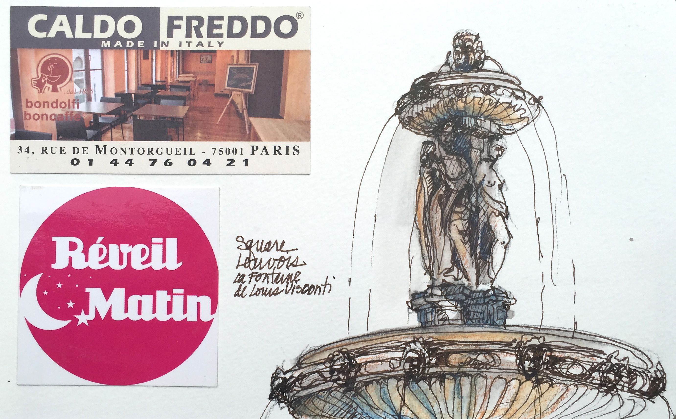 The magazine stand by our coffee stop one mid morning in the 2nd arrondissement, and a beautiful fountain, Fontaine de Louis Visconti at Square Louvois.