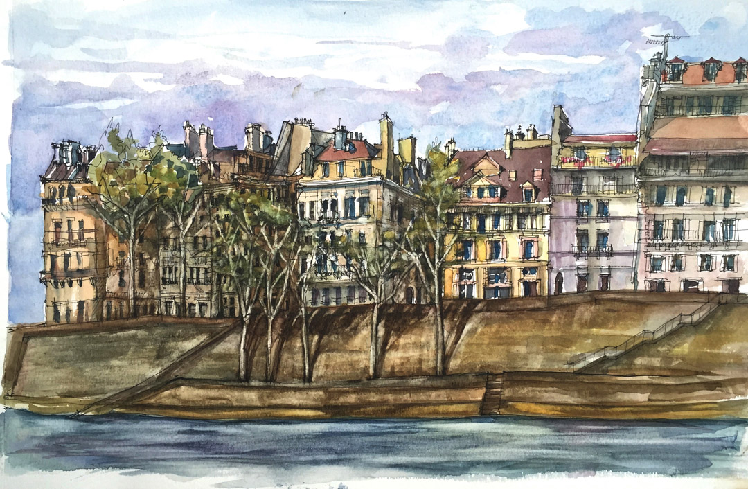 It’s an ink (pigma micron) and watercolor, 10″ x 15″. I sat on the banks of the Seine in the same place I had sat and sketched back in 2006 when we first visited Paris together.
