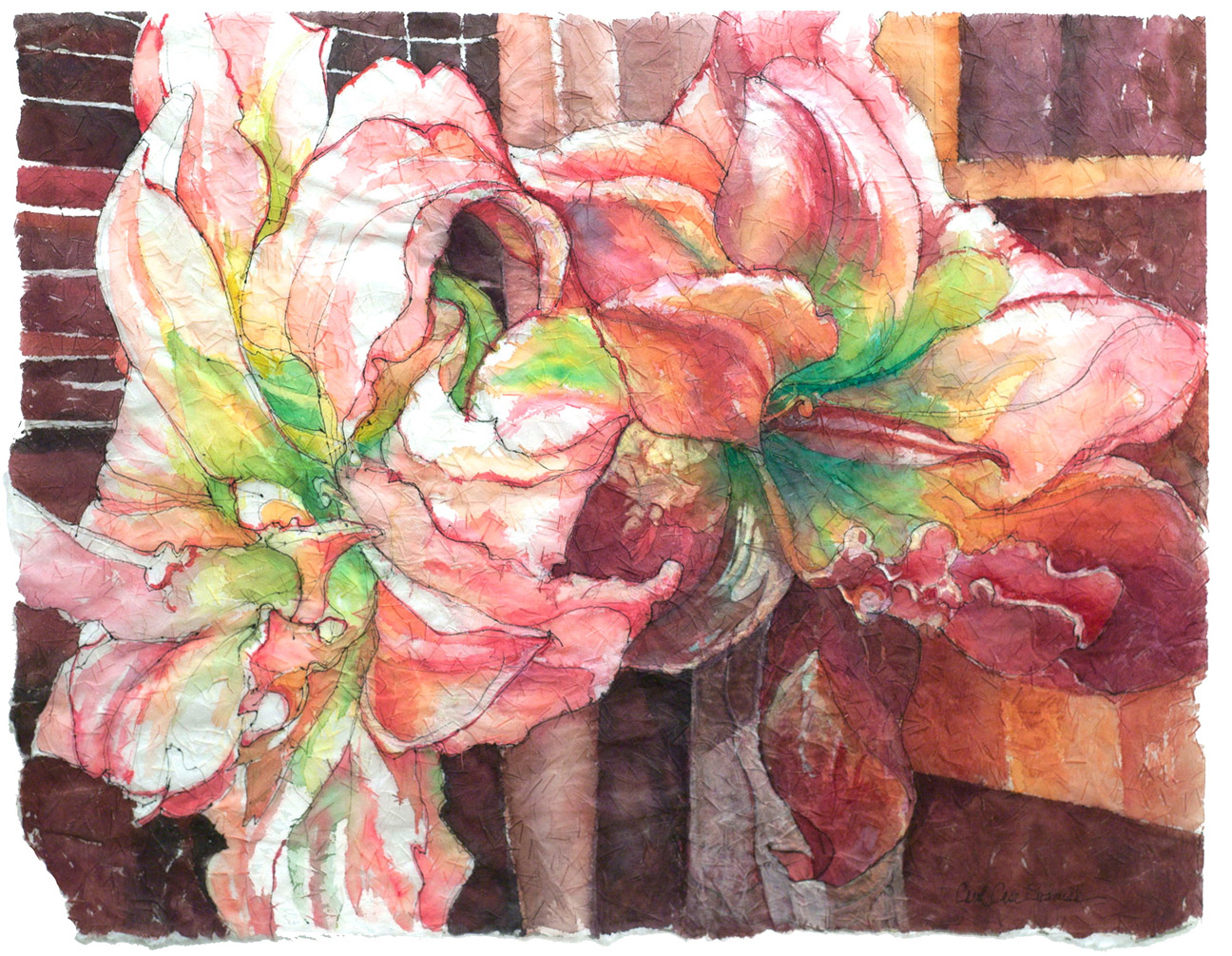 amarylis photo.webBefore I tried any painting, I sketched the beauty in my moleskin sketchbook with pigma micron pens. It obviously begamarylissketch2.webged for color.  In Sally Treanor’s Watercolor Salon on Mondays we were trying our hands at ink and watercolor on rice paper.  What better subject, I thought.  I had forgotten a lot about painting on rice paper, especially how you really have to be patient and let it dry in between layers.