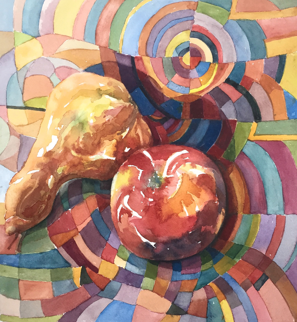 The painting I just finished, called “Sonia!”, is a solution to the pear and apple painting exercises we were doing in Sally Treanor’s class. Since rediscovering Sonia Delaunay in the Pompidou in Paris, I have been dreaming Delaunay, hence the title, an obvious homage.